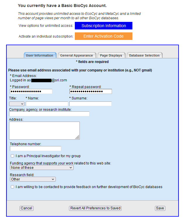 If you have problems accessing your account on any of our BioCyc servers (ie BioCyc, EcoCyc, MetaCyc, BSubCyc and HumanCyc),